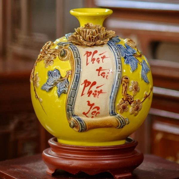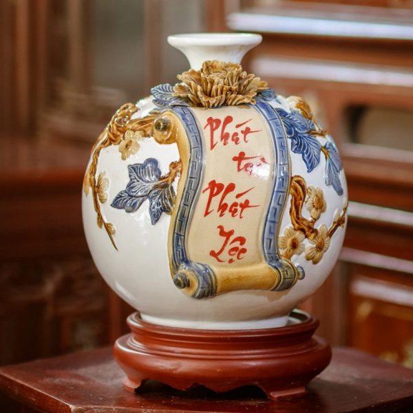 Bình hút lộc được đắp nổi lên bề mặt nhờ đôi tay khéo léo của những nghệ nhân trong làng gốm truyền thống Bát Tràng để khách hàng lựa chọn, để tăng tính sang trọng thì bình hút tài lộc có thể được tô điểm bằng một lớp vàng kim – vàng thật, cao cấp.