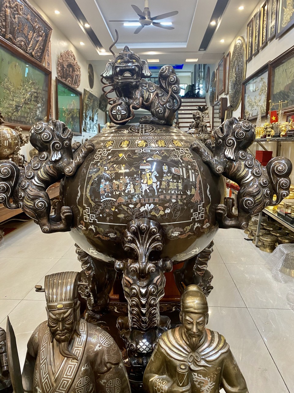 Qủa đỉnh thất lân vờn cầu được làm bằng đồng đỏ nguyên chất. Phía dưới đỉnh cầu có ba chân trụ là ba con nghê ôm lấy đỉnh vô cùng vững chắc. Bao quanh là các họa tiết được khảm bạc. Phía trên lắp đỉnh là một con nghê đứng uy nghi, tráng lệ. Phần thân của quả cầu được khảm ba cảnh: Cảnh vinh quy bái tổ, cảnh đồng quê, cảnh Lã Vọng câu cá. Cả ba cảnh tượng trên đều được chạm khảm vô cùng tinh xảo và thiếp bạc, vàng để nổi bật trên nền đồng đỏ.