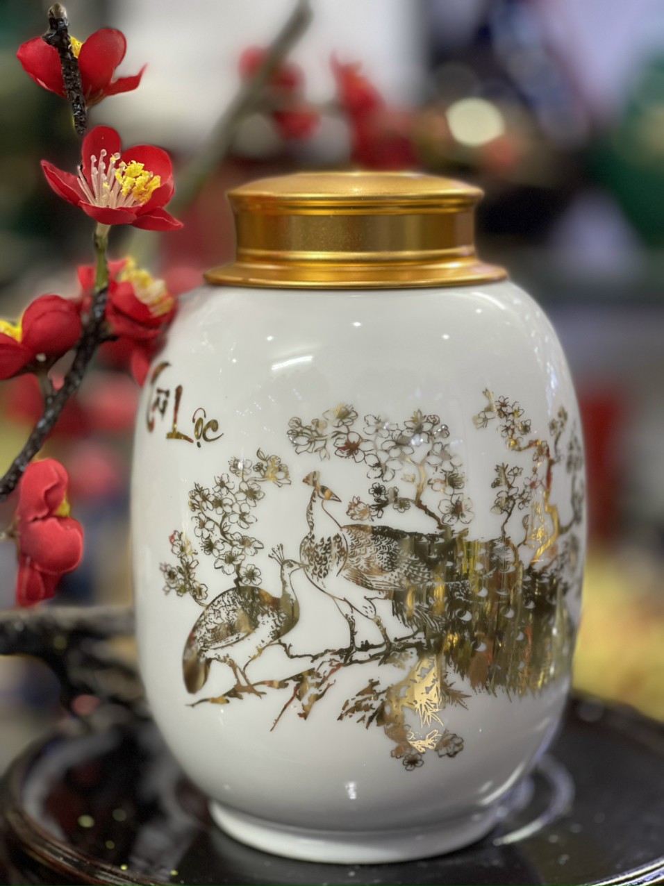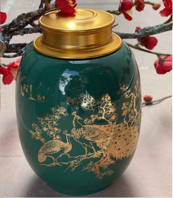 LỌ ĐỰNG CHÈ VẼ VÀNG : CHIM CÔNG TÀI LỘC